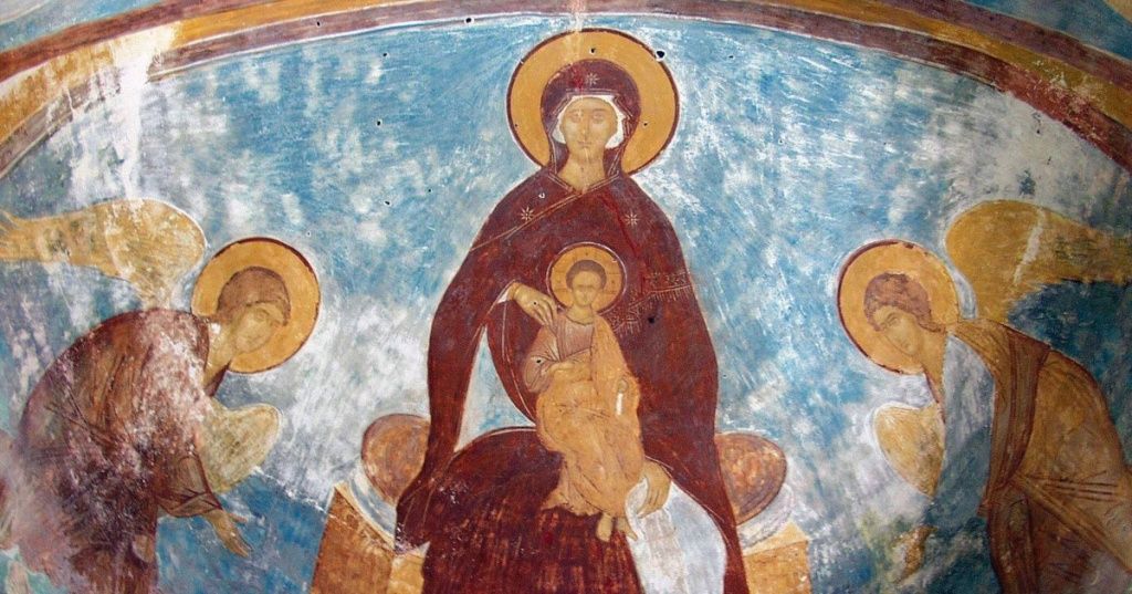Запечатленная буквами в книгах и звуками церковных песнопений Похвала Божией Матери, акафист Которой составлен в память заступничества Царицы Небесной при нападении врагов на Константинополь в 626 году, будто отпечаталась на стенах древнего Богородице-Рождественского храма в Ферапонтовом монастыре: в начале XVI столетия трудами знаменитого древнерусского иконописца Дионисия были созданы фрески, запечатлевшие в красках образы, которые мы находим в акафисте.