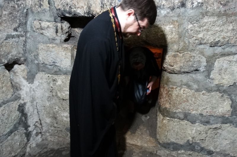 Спускаемся по узкой лестнице, внизу душно. Чтобы попасть в гроб, надо спуститься в нишу и сильно нагнуться. Внутри – вырубленное ложе для тела почившего. Душно. Здесь совсем не так, как в Гробе Спасителя. Место Воскресения пропитано светом жизни, благодатью принесенной жертвы. Место погребения Лазаря мрачно и наводит на мысль о хрупкости и недолговечности человеческой жизни.
