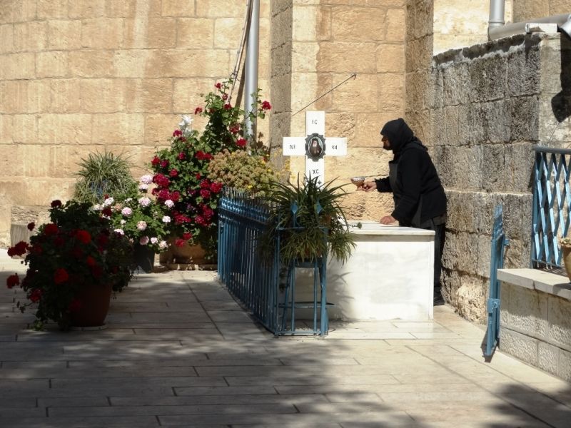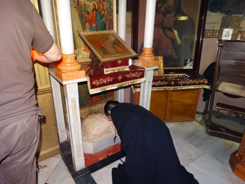 Рядом – греческий женский монастырь святых Марфы и Марии. В храме обители есть камень, на котором сидел Спаситель перед тем, как пойти к гробу Лазаря. Заходим поклониться святому месту. Нас встречают две монахини-гречанки, уже старицы. Они нам рады, дарят свечи и иконки. Лобызаем камень и поем тропарь святым сестрам Марфе и Марии.