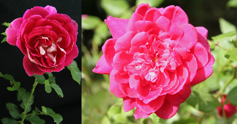 Слева с краю – Роза дамасская. Тоже ясно. Это родоначальник класса старых садовых роз. Rósa damascena – вид секции Gallicanae рода Шиповник. Это декоративное садовое растение с давних времён выращивается в странах Ближнего Востока. В Европу оно было завезено из Сирии в 1875 году. По современным данным, дамасские розы произошли в результате гибридизации видов (Rosa moschata × Rosa gallica) × Rosa fedschenkoana.