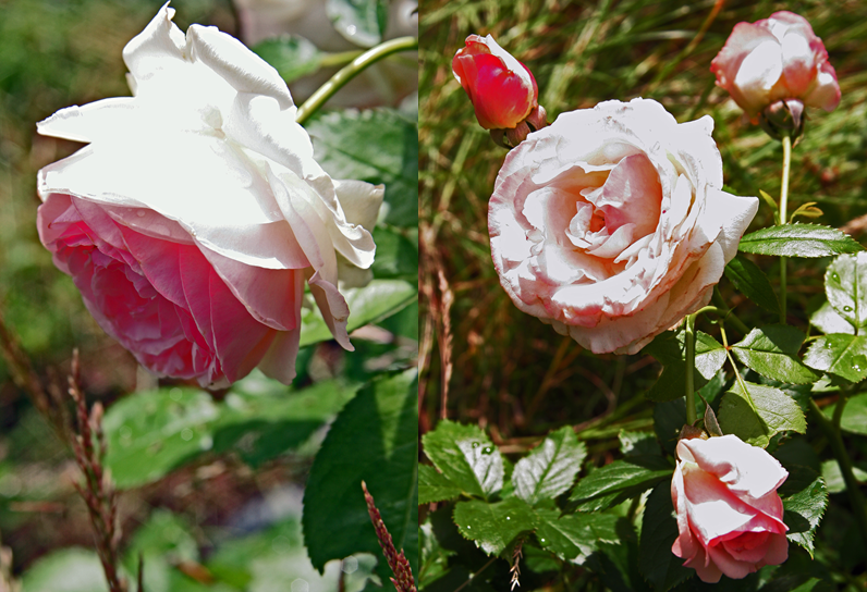 Розы Кадашевского храма (Москва): полуплетистые розы с разными типами цветков. Фото Александра Дегтярёва.