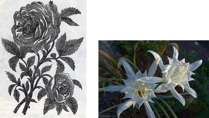 Изображение саронской розы из Библейской энциклопедии, 1891; «Лилия Шарона» (панкраций морской) с побережья Кипра. Фото Ангелины Волковой, 2011 г. Источник – www. liveinternet.ru.