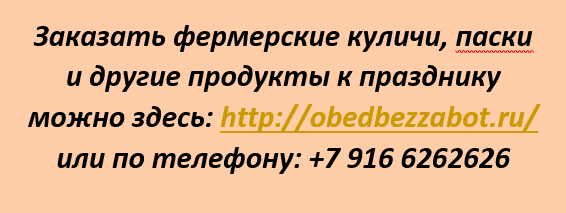 Заказать фермерские куличи, паски и другие продукты к празднику можно здесь: http://obedbezzabot.ru/ или по телефону: +7 916 6262626
