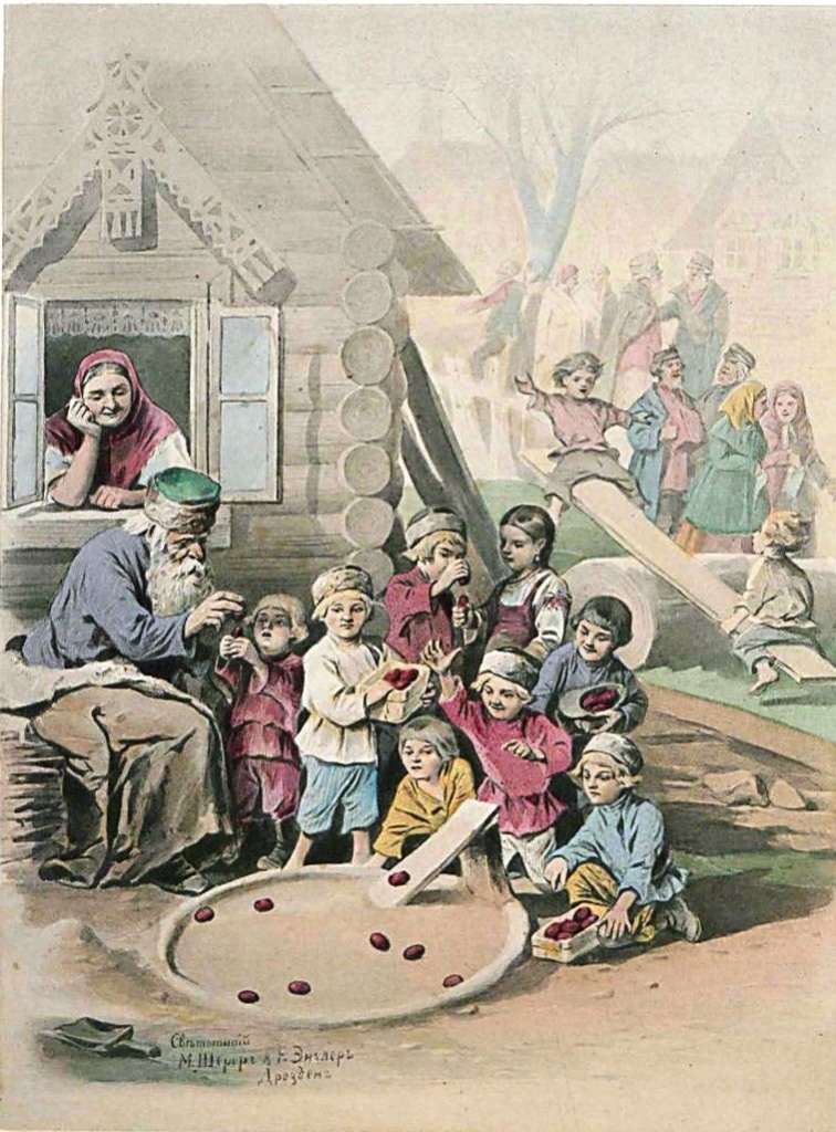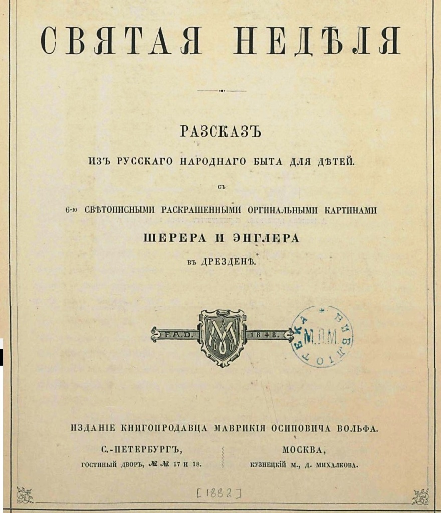 Вот перед нами книга, казалось бы, посвященная самой русской теме – Пасхе и ее празднованию на селе. Изданные в 1882 году рассказы из русского народного быта для детей. Но что это? Яркие красочные иллюстрации к ней – это на самом деле «светописные раскрашенные оригинальные картины» фотоцинкографии Шерера и Энглера в Дрездене, о чем и сообщается на обложке.