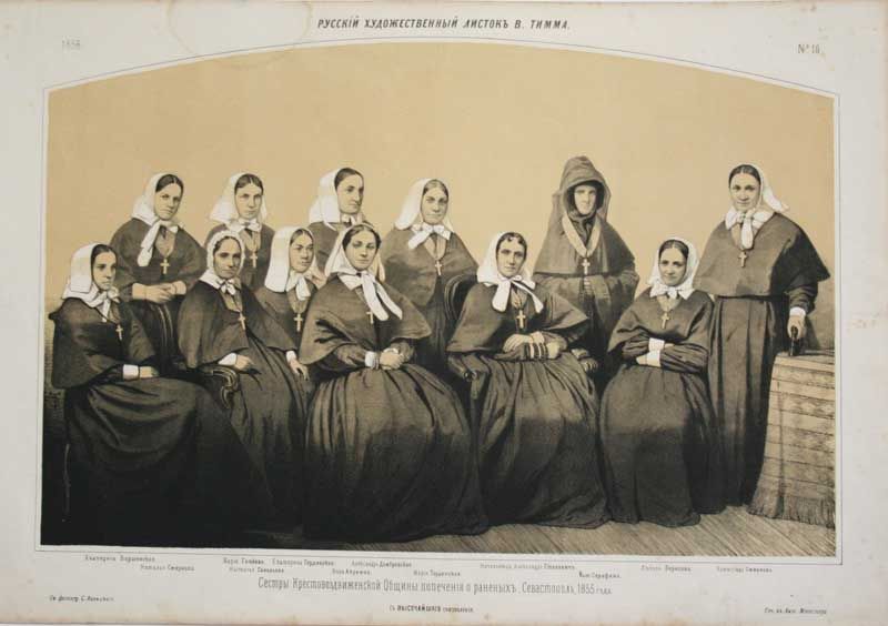 На следующий день они отправились в Севастополь, где сестер принял под свое руководство профессор Медико-хирургической академии Н.И. Пирогов. Через некоторое время женский отряд пополнился прибывшим на фронт новым составом сестёр. Так образовалась первая в мире женская община по уходу за ранеными в Крымской войне – Крестовоздвиженская община. Для сестёр милосердия была утверждена особая форма одежды: коричневое платье c белыми обшлагами, белый фартук и такого же цвета чепчик установленного образца.