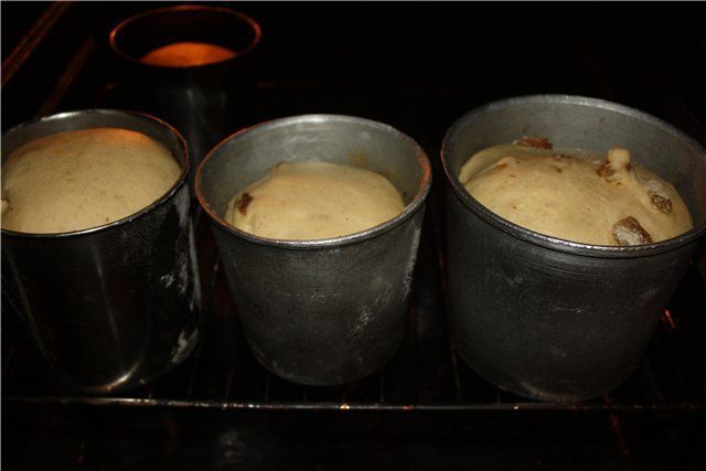 Тестом заполнить формы. Для получения пышного кулича − на одну треть высоты, для более плотного − на 1/2 высоты. Формы подготовить так: дно покрыть кружком белой промасленной с двух сторон бумагой, стенки помазать маслом и обсыпать мукой.