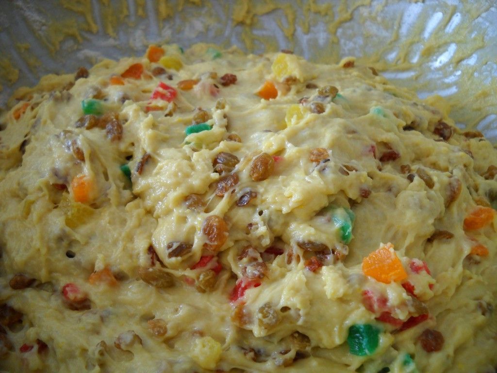 Когда оно увеличится в объеме в два раза, добавить промытый и просушенный изюм, цукаты, нарезанные кубиками, и мелко нарубленный миндаль, очищенный от кожицы.