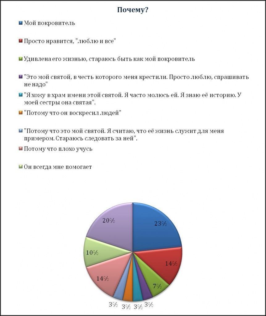 Я склонна была с ней согласиться и заранее признать, что идея опроса банальна и неудачна, но теплилась надежда: а вдруг да получится что-то интересное?По совету директора школы опрос делали не устный, а письменный: раздали детям карточки с вопросами «Какой святой твой любимый?» и «Почему?» Самой младшей участнице опроса исполнилось шесть лет, самой старшей (так уж получилось) – семнадцать.Конечно, карточки заполняли и мальчики.