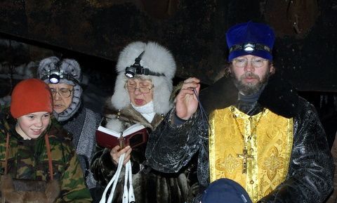 Помощник с текстом под рукой, шахтерские лампочки светят, клирос поет, народ молится, речка шумно плещется о стойки моста. А над всей этой полночью сходит с небес на землю Господня благодать и освящает быстро текущие воды разговорчивой горной речушки.