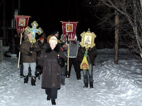 К одиннадцати часам вечера желающие собрались к храму, разобрали хоругви, иконы и все потребное для крестного хода.