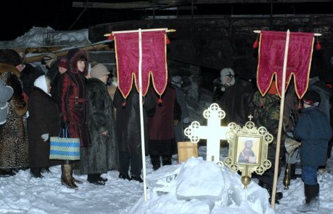 У ледяной горки укрепили хоругви, поместили иконы, и вот на горке засияло в лунном свете распятие.