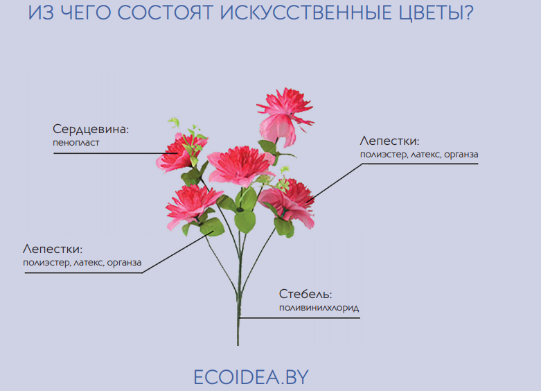 Такие цветы изготавливают из различных компонентов – синтетических тканей, обработанных различными химическими составами, пластика, ПВХ, пенопласта. Это делает невозможным правильно разделить типы пластика для грамотной сортировки и дальнейшей переработки мусора.