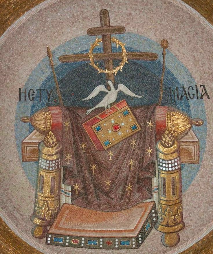 На этом престоле (символ Отца) лежит Евангелие (символ Сына), а над ними парит Дух Святой в виде голубя. В целом это аллегория Святой Троицы, которая являет Себя во всей Своей полноте после Пятидесятницы.
