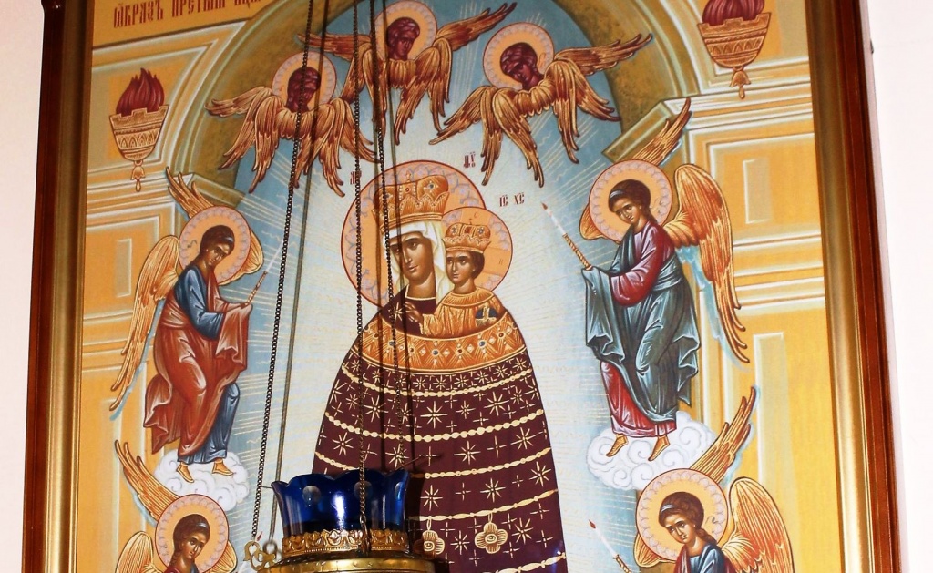На облаках по обе стороны от Богородицы – по два Ангела, каждый обеими руками держит зажженные свечи. Над главой Матери Божией – три огненных шестикрылых Херувима, четвертый – в Ее подножии. Херувимы – хранители Божией мудрости. В верхней части иконы по углам находятся две горящие лампады.