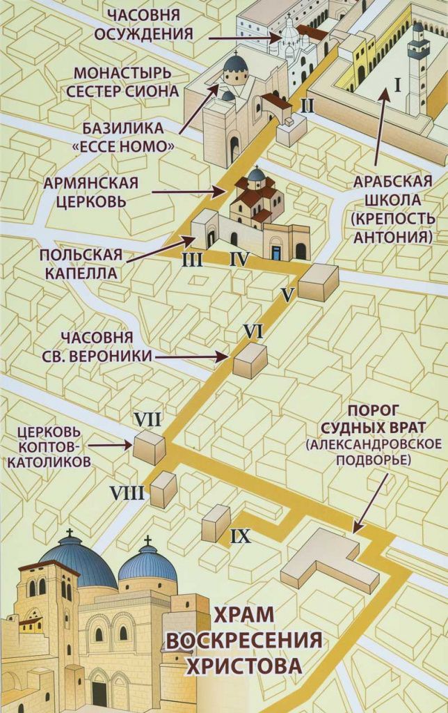 Каждую пятницу в городе Иерусалиме с 15 часов начинается впечатляющее шествие по маршруту Крестного пути, организуемое монахами ордена францисканцев. В настоящее время он обычно начинается от стены медресе Аль-Омарийа (мусульманской школы) недалеко от Львиных ворот Старого города. Примерно здесь стояла крепость (дворец), в которой Иисус был осужден. Крестный путь паломников сегодня делится на четырнадцать основных стояний (остановок), из которых пять последних находятся в самом Храме Воскресения Христова. Не у всех из нас есть возможность побывать в Иерусалиме и пройти тем путем, которым шел Спаситель, но благодаря милости Божией мы можем, побывав на богослужениях Страстной седмицы, перенестись мысленным взором в те места.