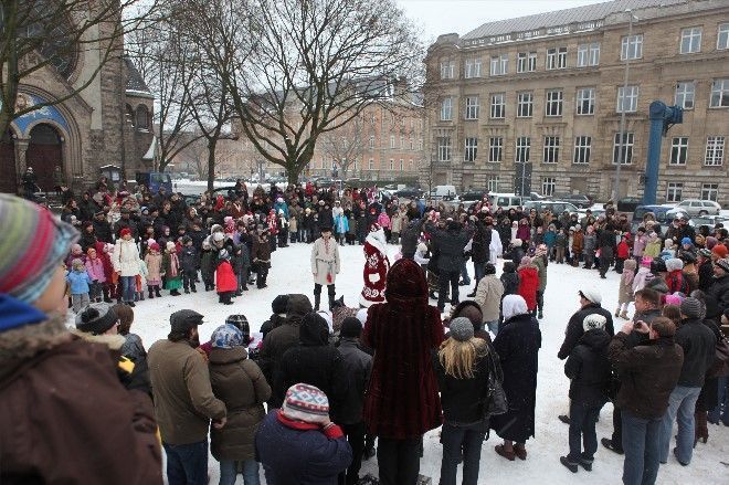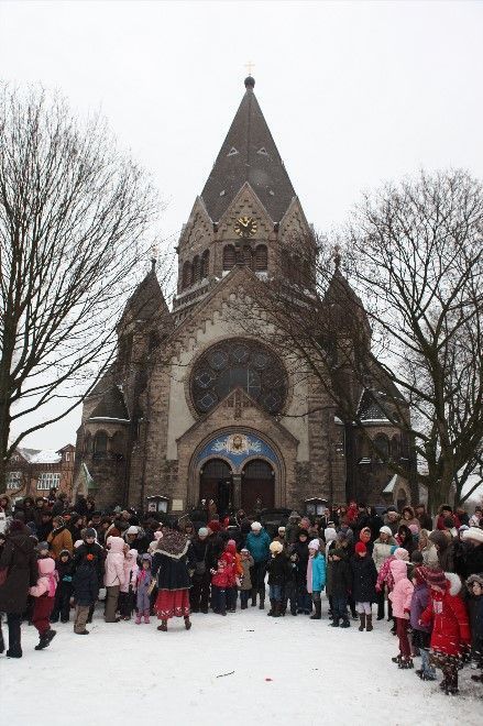 В Берлине не так уж часто можно увидеть снег на улицах, но в некоторые годы площадь перед храмом покрывалась сугробами, и тогда получались настоящие святочные гуляния.