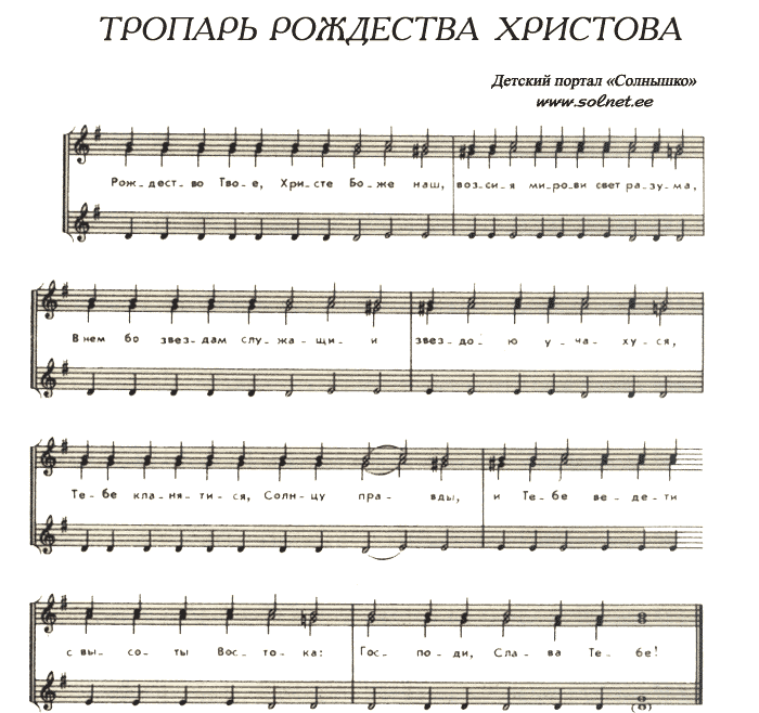 Издавна праздники отмечали не только посещением богослужений, торжественными застольями, но и песнями. В наше время многие вспомнят немало новогодних песен, но сколько песен, посвященных Рождеству Христову, знаем мы и наши дети? Портал «Приходы» подобрал несколько простых, но красивых песен, которые можно разучить с детьми на праздник. В помощь родителям мы не только приводим слова и ноты, но также записи исполнения этих произведений.