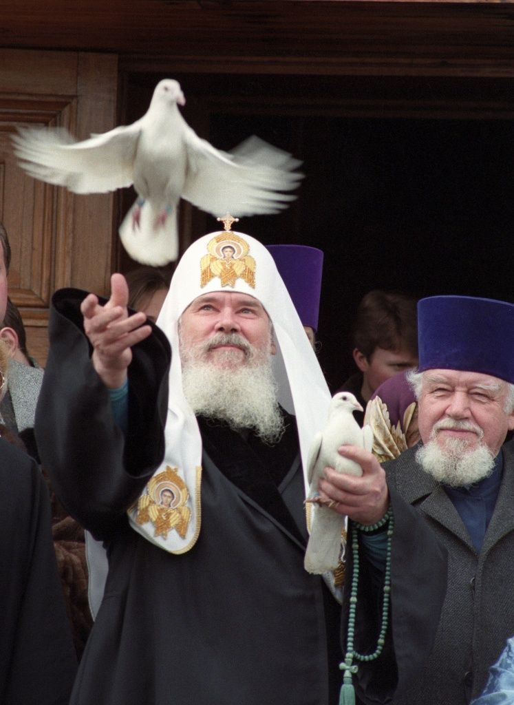 Снимок, о котором мы говорим, был сделан 7 апреля 1998 года. За год до того тоже получился хороший кадр, но там не было динамики: здесь всем понятно, что птица взлетает, у нее даже крылышки немного смазаны, а на снимке 1997 года Патриарх просто держит двух голубей, подняв вверх руки. Его тоже перепечатывали различные издания, но тот снимок, что сделан в 1998-м, известен больше всех.