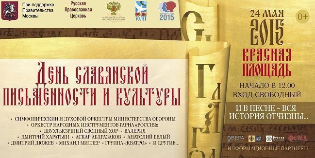 24 мая 2015 года одновременное проведение торжественных концертов запланировано во многих городах нашей страны (с прямыми включениями в телевизионную трансляцию на Красную площадь в Москве). Все программы начнутся в 12.00 по московскому времени. Мероприятие откроется приветственным словом Святейшего Патриарха Московского и всея Руси Кирилла перед началом концерта на Красной площади.