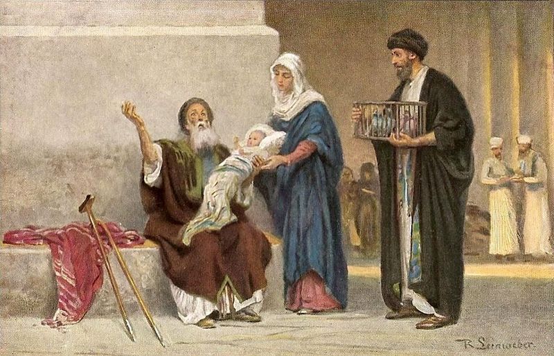 На рубеже Ветхого и Нового Завета, при захождении одной и восхождении другой зари праведный старец, преклонив колена, передал Младенца его Матери, и Она понесла Его в мир, который так нуждался в возрождении и милосердии, где было так много больных, отягченных злобой, скорбями, грехом и пороком.