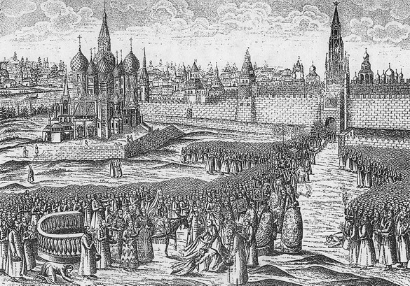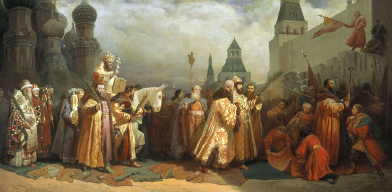 Когда процессия вступала в Спасские ворота Кремля, по всем московским церквям звонили колокола. У стен Успенского собора шествие останавливалось. Царь и Патриарх обменивались поцелуями. Государь отправлялся во дворец, а Патриарх – в храм. Это действенное выражение византийской идеи симфонии властей, с ее внутренней иерархией – важнейшая государственная концепция Московской Руси.