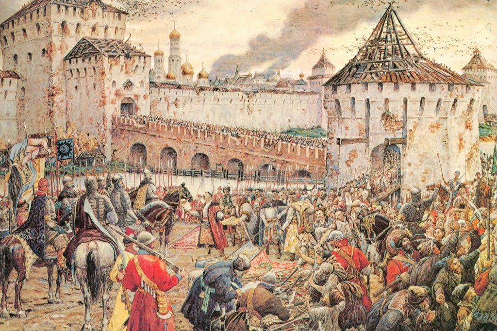 В 1395 году, когда Тамерлан, разорив Рязань, направился к Москве, уничтожая и опустошая все вокруг, решено было перенести чудотворную икону из Владимира в Москву. Ее встречали на Кучковом поле и перенесли в Успенский собор. Тамерлан, простояв с войском две недели на одном месте, внезапно устрашился, повернул на юг и вышел из московских пределов: «Бежал гонимый силою Пресвятой Девы».