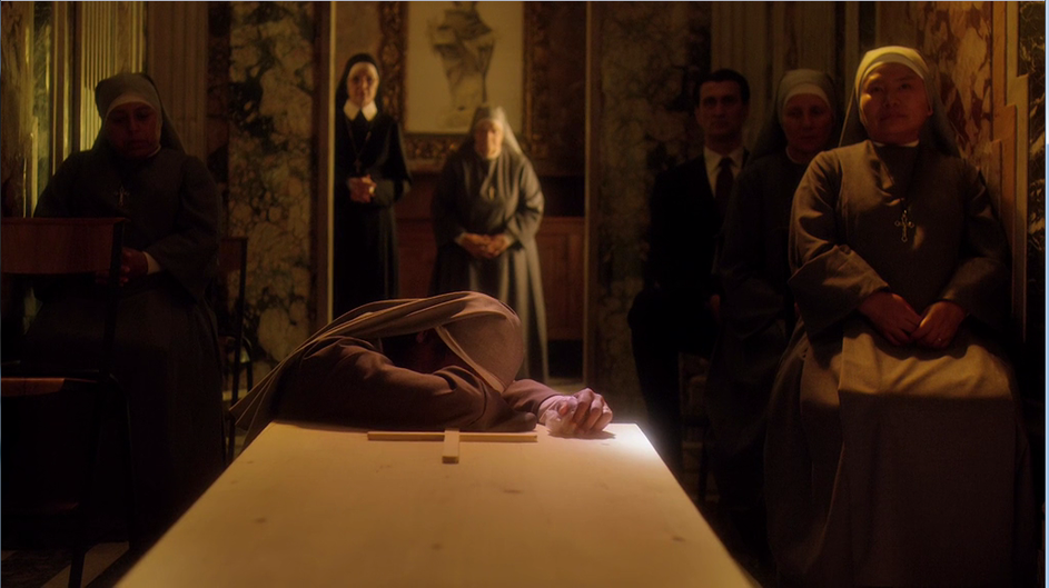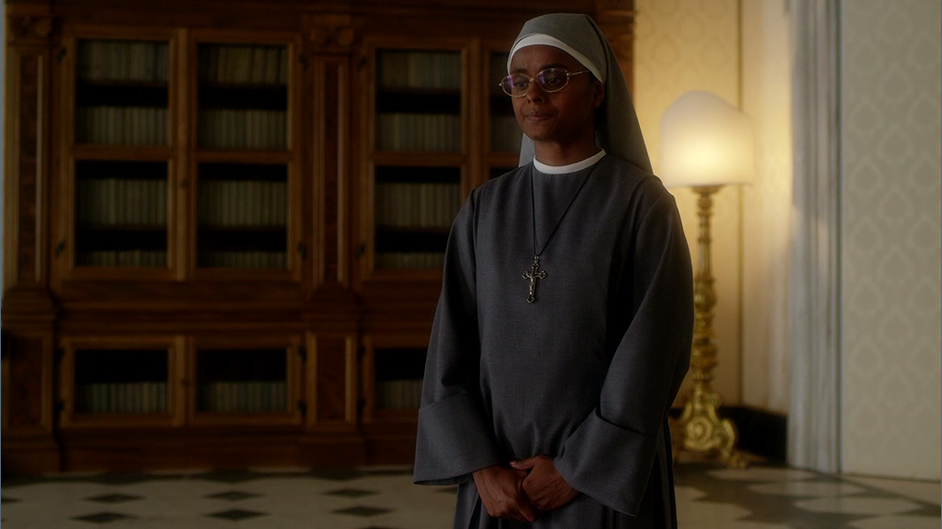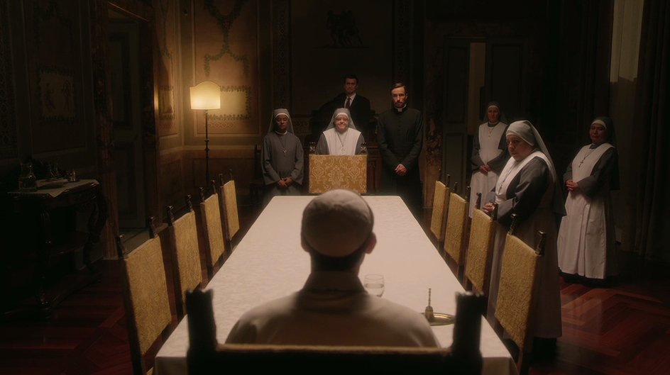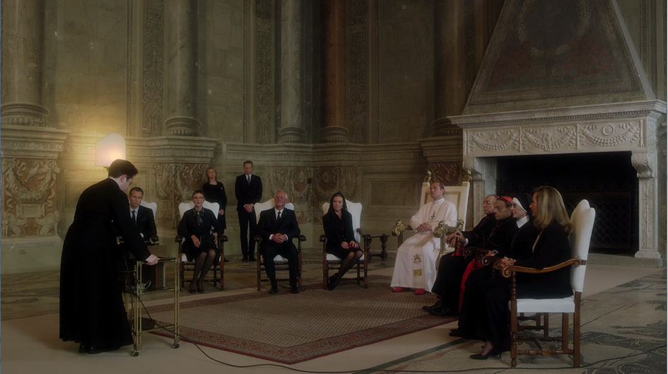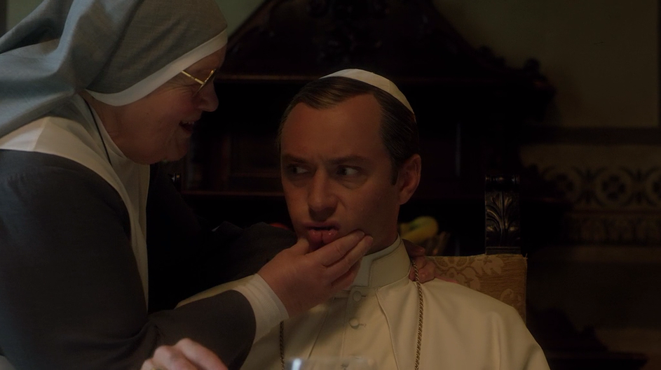 Поведение сестры Биче фамильярно: вся сцена нарочито гипертрофирована, чтобы расставить персонажей по местам и провести между ними резко очерченный водораздел. Эта сцена – повод для блестящей речи Папы о пользе формальных отношений. По сути, нас пытаются убедить, что Папа – это жесткий правитель, который выстраивает границы и держит дистанцию, не вступая в близкие отношения с людьми. Зритель, который примет эту упрощенную модель, пойдет своей мыслью немного не в ту сторону.