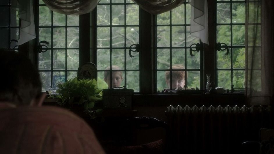 Небольшая ремарка о движении камеры в момент молитвы Ленни. Мы видим, как комнату заливает свет. Для того, чтобы зритель понял, что это свет не солнечный, появляется краткий кадр дома снаружи: и видно, что свет заключен внутри.